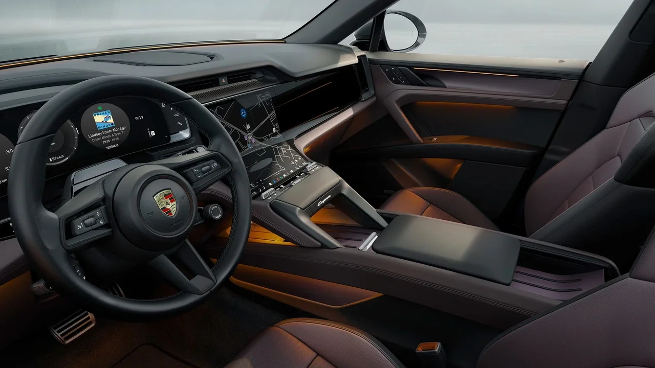 Hybrid-specific displays show energy flow and battery usage. The curved instrument cluster integrates performance and efficiency data. The central touchscreen provides system control. Interface clarity remains consistent with Porsche design.
